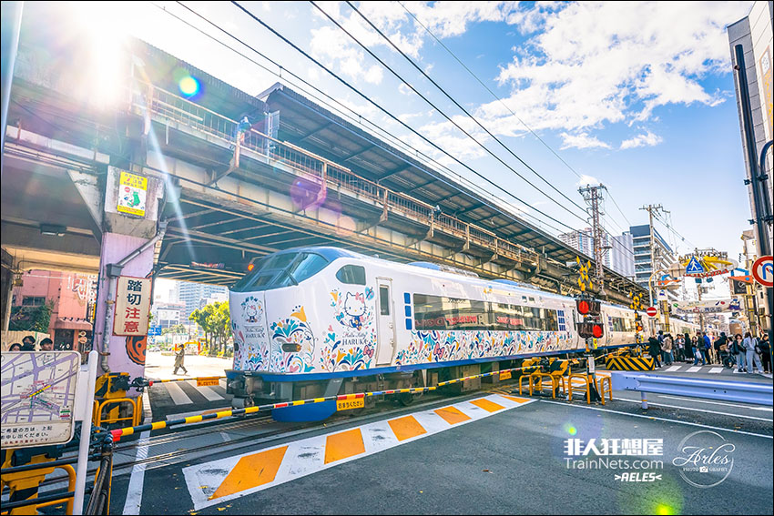 2025年12月。日本大阪。 Hello Kitty涂装関空特急列车驶过道口。