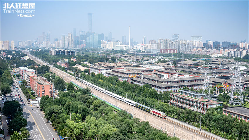 2025年8月,DF4D“花老虎”牵引北京市郊S2线车底回送驶上东星联络线。市郊铁路S2线所使用的25DT型车底不定期会送至北京车辆段进行检修,故能够在城区内捕捉到它的白色身影。