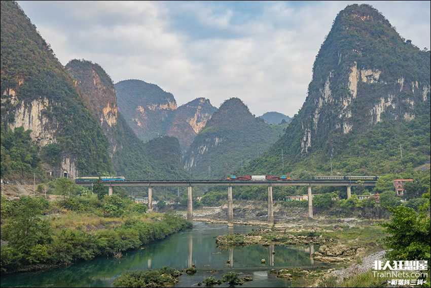 2025年12月,黔桂线,超限列车70003次驶出六甲站,因列车严重晚点得以在白天通过山水相间的小三峡景区。