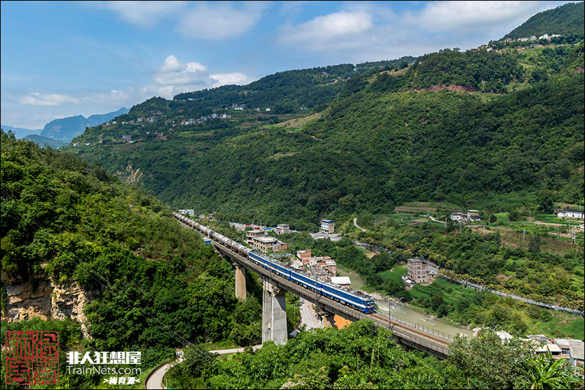 2025年10月,内六线,在大关站加挂补机后的下行货列行驶在大关-曾家坪子区间。