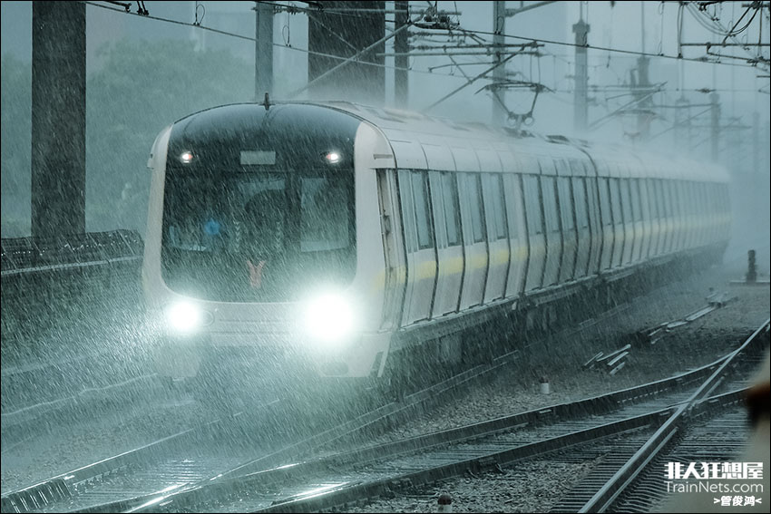 2025年6月,广东广州,台风“蝴蝶”吹袭,广州地铁1号线列车迎住大雨驶入坑口站。