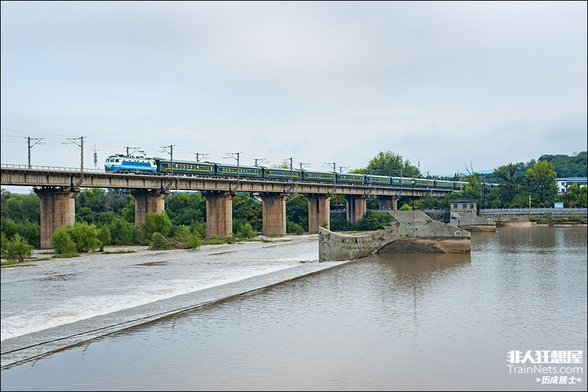2025年10月。SS8牵引客车行驶在焦柳线通过洛阳龙门石窟景区。