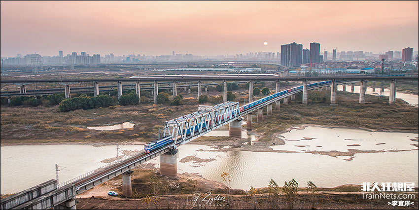 2025年11月24日,武黄线,DF8-0035牵引49871次集装箱大列跨越滠水河,下穿京广高铁。