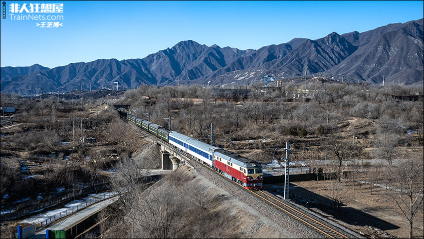 2025年12月,6438次(大涧-北京西)加挂中朝联运车底行驶在京原线上,为国际列车复开做准备。
