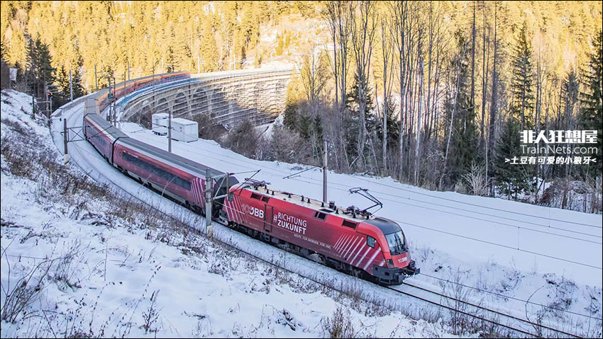 2026年1月。”100 Jahre ÖBB”特别涂装Railjet列车运行在奥地利塞默林铁路的Wolfsbergkogel至Breitenstein区间,通过Kalte‑Rinne高架桥。
