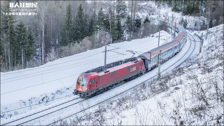 2026年1月。EC78 Croatia(Zagreb Glavni kolodvor-Wien Hbf)列车运行在奥地利塞默林铁路的Wolfsbergkogel至Breitenstein区间。