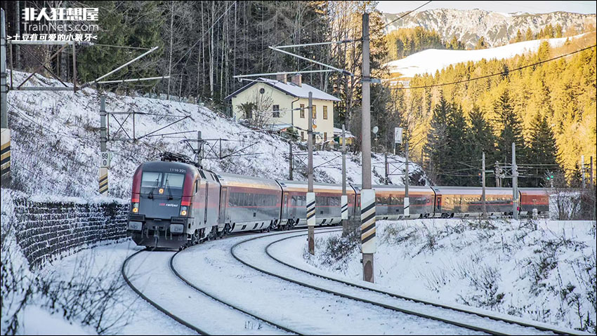 2026年1月。Railjet列车运行在奥地利塞默林铁路的Breitenstein至Wolfsbergkogel区间,通过位于Carl Ritter von Ghega Museum下方的经典弯道。