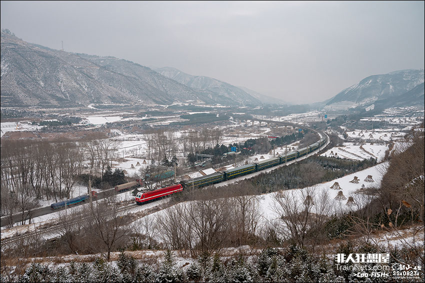2025年1月2日,宁夏固原。SS7E牵引K628次列车(固原-兰州)行驶在宝中线安国镇-三关口区间。列车跨过被大雪覆盖的颉河,即将驶入六盘山展线。