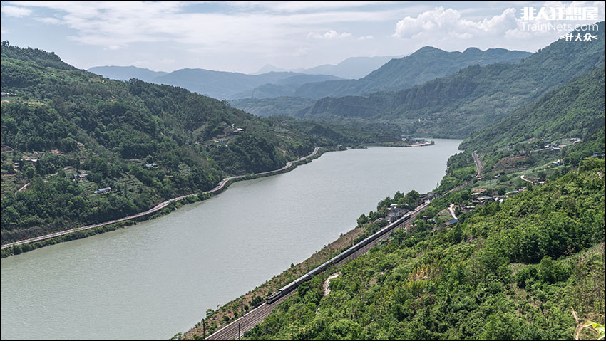 2025年5月19日,四川乐山,成局西段SS3-5151“共青团号”牵引5620次列车上行出杨漩站,在正午的阳光中沿着老成昆铁路穿行于小凉山和大渡河之间。