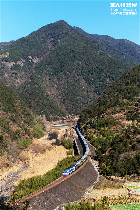 2025年2月8日,K307次列车(兰州-温州)在驶出石笕岭隧道后途经郎池村,即将进入郎池隧道。