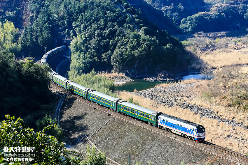 2025年2月8日,K944次列车(温州-贵阳)驶出郎池隧道,从郎池村旁经过。