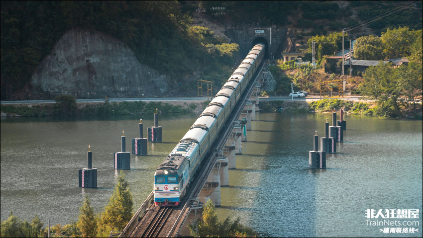2025年10月3日。金温线。DF4B-9482牵引K2906次(温州-西安)驶出燕端隧道,通过大溪铁桥。
