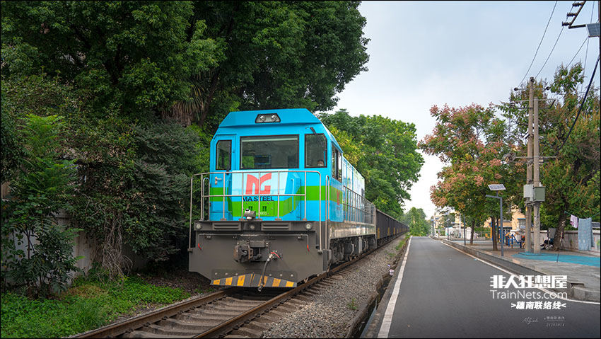 2025年10月1日。马鞍山专用线。蓄电池驱动的CEA2E1-0001牵引铁矿列车通过健康路道口。