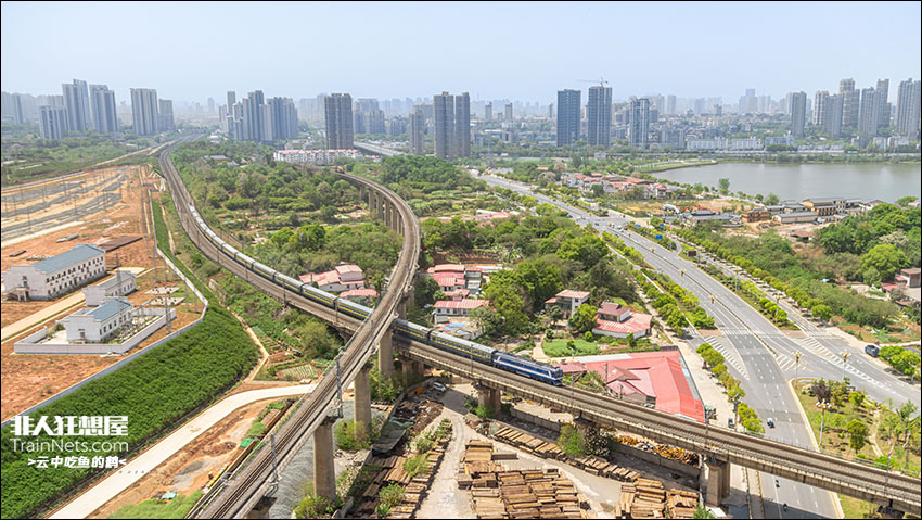 2025年4月。京九线九江-孔垄段。合九线旅游列车出乎意料的用上了DF8B作本务,在缓慢爬上引桥后向九江长江大桥主桥驶去。