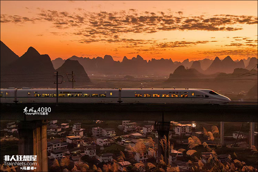 2025年11月,贵广客专,CRH2A在晚霞下穿过喀斯特地貌区。
