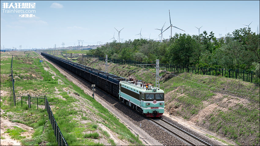 2025年7月30日。包兰铁路。兰局迎段SS3-5046担当货列开出小坝站,行驶在草原上。夏日的荒漠迎来了些许的绿色点缀。