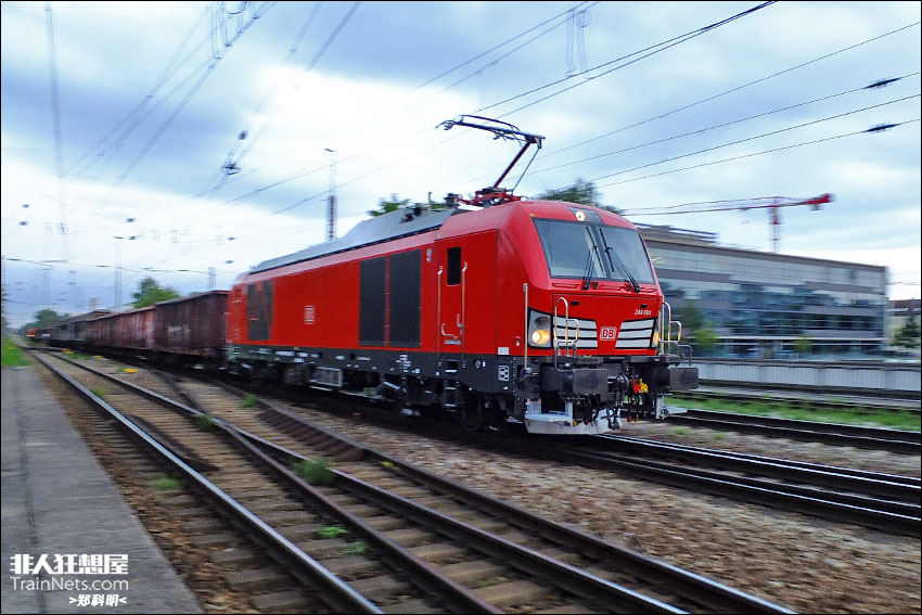 2025年8月。慕尼黑,傍晚,BR249(Siemens Vectron)双源机车牵引货车快速通过。