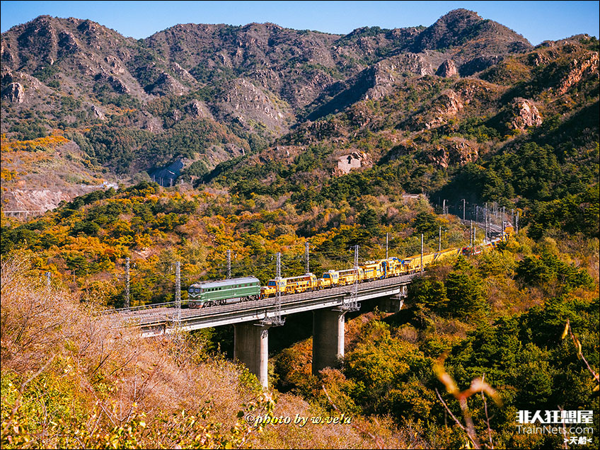 2025年10月,大秦秋季集中修,DF4B牵引清筛大机车组穿行于京北山区。
