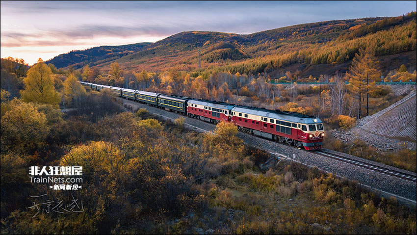 2025年9月。内蒙古兴安盟阿尔山市。沈局白段DF4D-0192+0441双机牵引K7566次(阿尔山-沈阳)行驶在白阿铁路上。在晚霞的映照下,白天金黄色的山林呈现出赤橙黄绿四种色彩交织融合的壮美画面,两台红色的DF4D型机车在山林秋色中绽放出艳丽的光华。