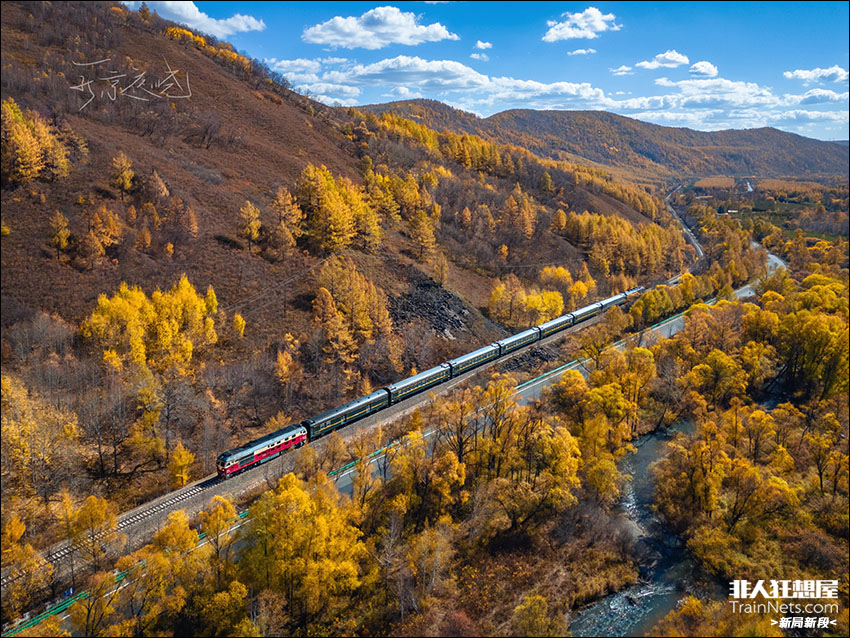 2025年9月。内蒙古兴安盟,沈局白段DF4D-0180牵引K7595次(白城~阿尔山)行驶在遍染金黄的大兴安岭山林之中,白阿铁路在此段与洮儿河和公路并行,列车穿越密林向白狼车站进发。