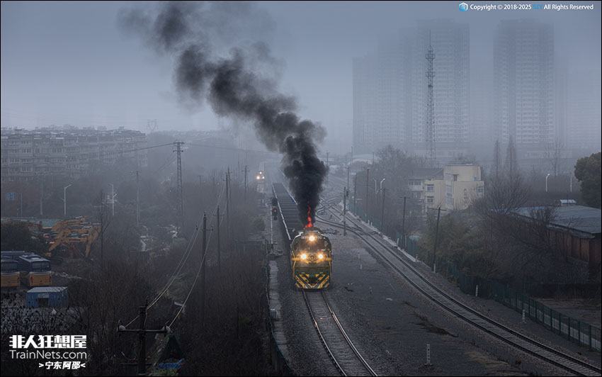 2023年2月,朦胧的冬日细雨间,ND5-309牵引煤炭重车喷火驶出南京城北环线丁家庄站。