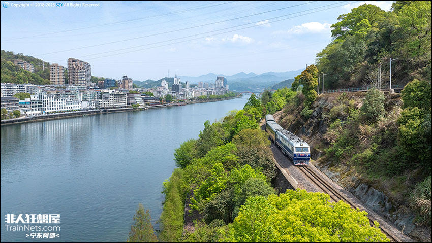 2025年4月,徽杭古道的山水间,上海局季度巡检列车通过金千铁路新安江段。