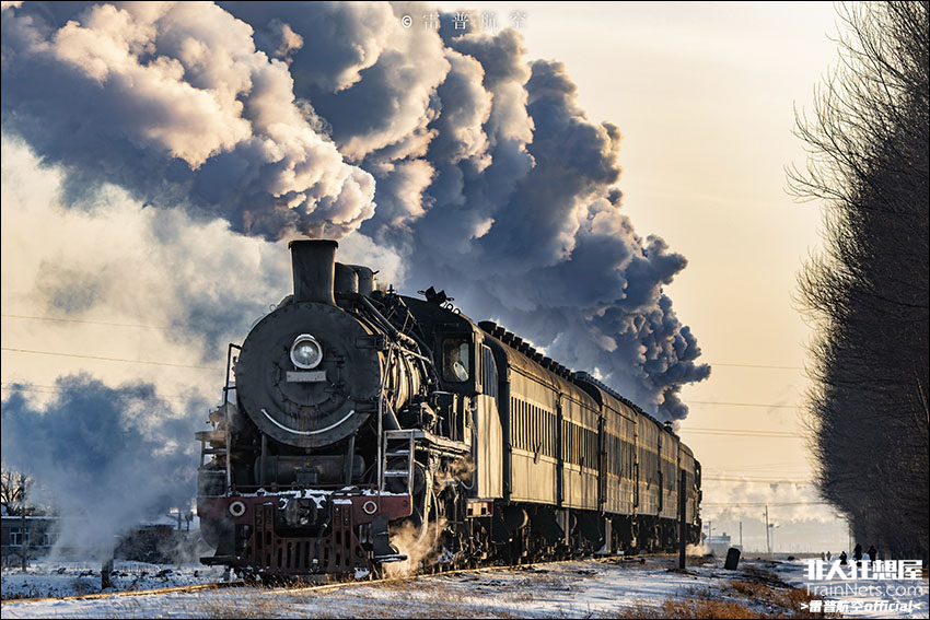 2024年调兵山蒸汽节,两台未翻新的上游蒸汽机车在夕阳的黄金光下推挽开行904次驶向调兵山站。