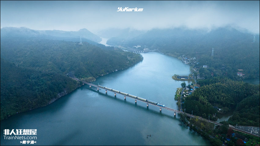 2025年10月10日,湖南省怀化市靖州苗族侗族自治县,SS8牵引焦柳小票车7269次(怀化-塘豹)跨越雨雾笼罩的水酿塘水库。
