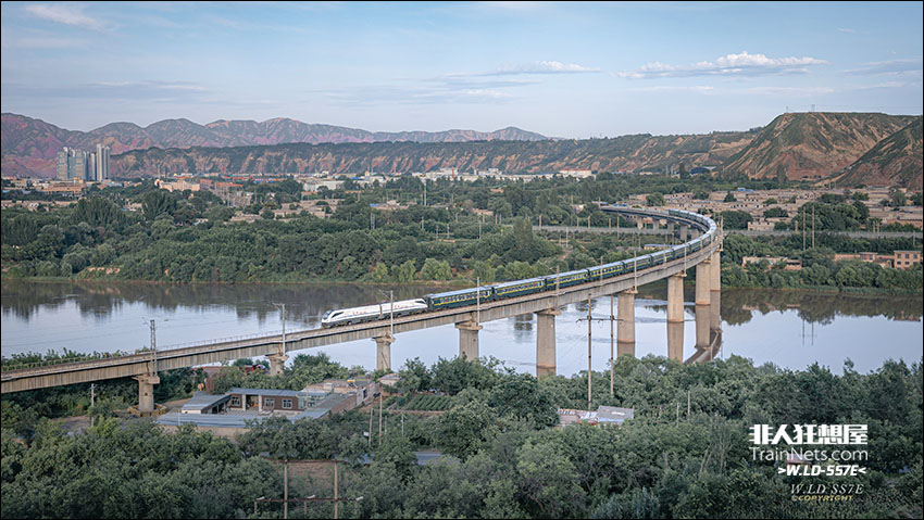 2025年8月,甘肃兰州。盛夏薄暮,FXD1 0002牵引Y667次(兰州-敦煌)通过河口南。满编大列搭配大桥半径较小的弯道,十足壮观。