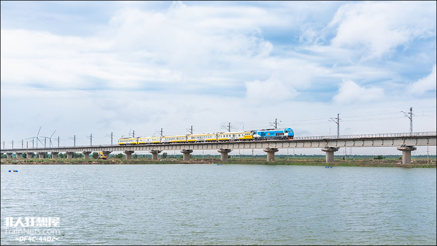 2025年6月,黄万铁路,特色涂装HXN3-7016牵引57019次检测列车掠过鱼塘