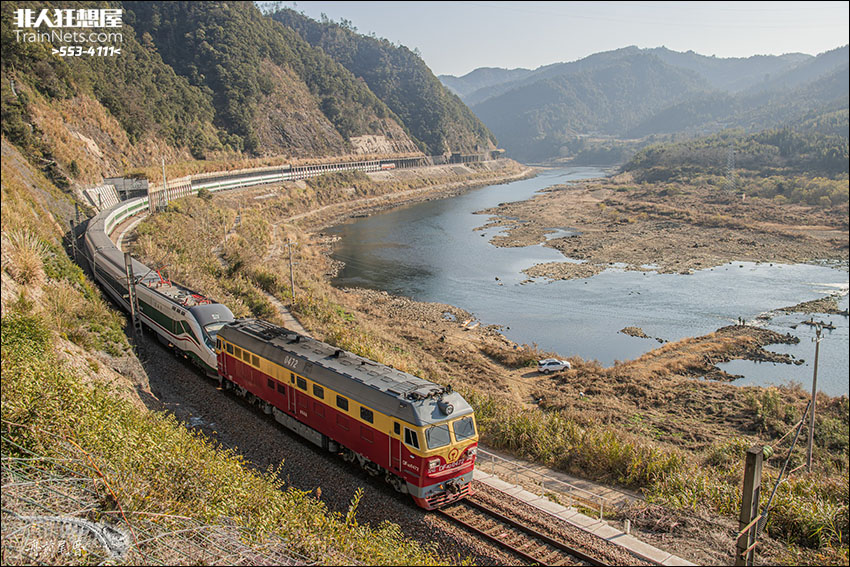 2026年初,午后闽北,鹰厦线,DF4D牵引的双行李实验动集驶过富屯溪畔。