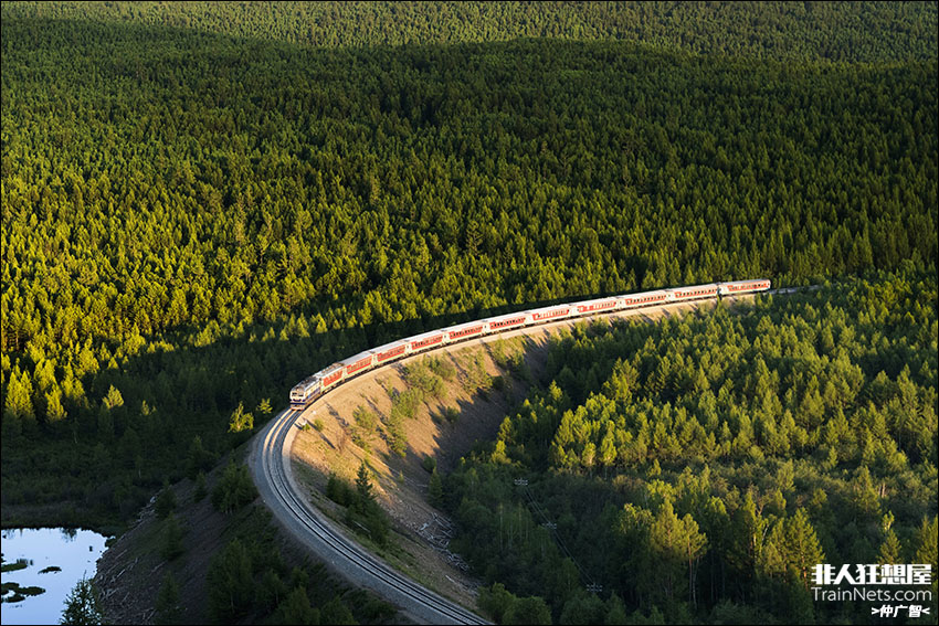 2023年6月21日,“呼伦贝尔号”旅游列车行走在日落前的岭北弯道上,红色车厢在夏日无尽的林海之中格外显眼。