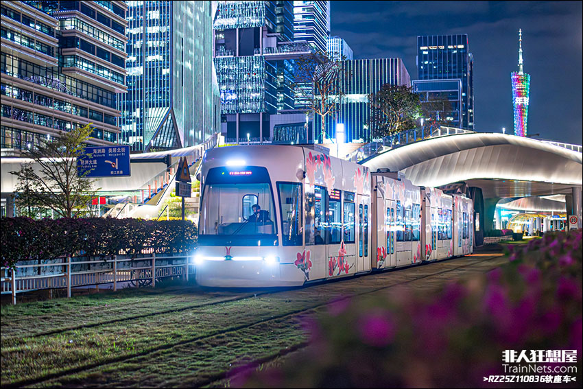 2025年12月25日,海珠有轨电车1号线,“标涂”列车在夜色中驶经珠江之吻景区,前往会展西站。