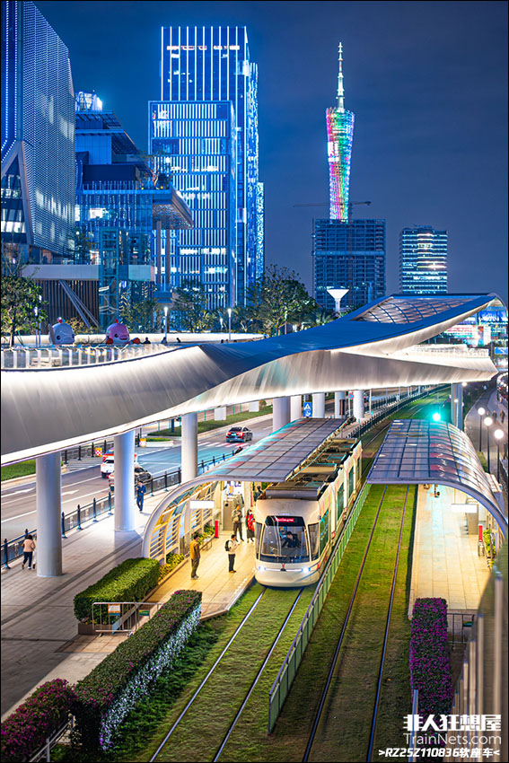 2025年12月25日,广州海珠有轨1号线,“标涂”列车在夜间停靠近期开放的“珠江之吻”景区旁的南风站,与身后广州塔映衬。
