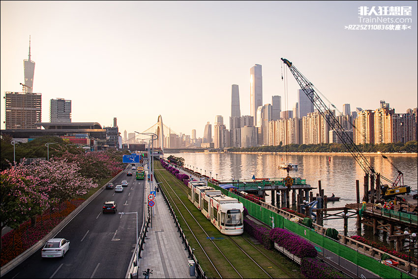 2025年12月18日,海珠有轨电车1号线,“标涂”列车在落日时分驶经阅江西路,与身后广州CBD相衬。