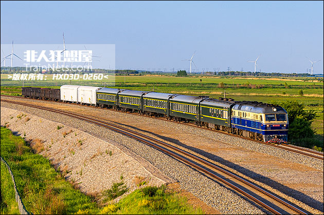 2025年6月17日,齐北线。DF11-0131牵引55302次(伊图里河-齐齐哈尔南场)接近塔哈站,对P80-A型大容积棚车进行线路动力学性能试验。(图/HXD3D-0260)