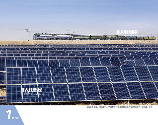 2022年2月。甘肃酒泉。酒额铁路。双机DF11牵引客车行驶在光伏阵之中。