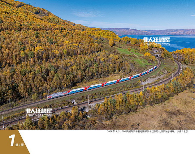 2024年9月。乌兰巴托铁路局担当的306次国际列车(伊尔库茨克-乌兰巴托)驶过斯柳江卡以东的秋日贝加尔湖畔。306次为6次(莫斯科-乌兰巴托)的缩线版本,并在伊-乌区间与4次(莫斯科-北京)的时刻相同。