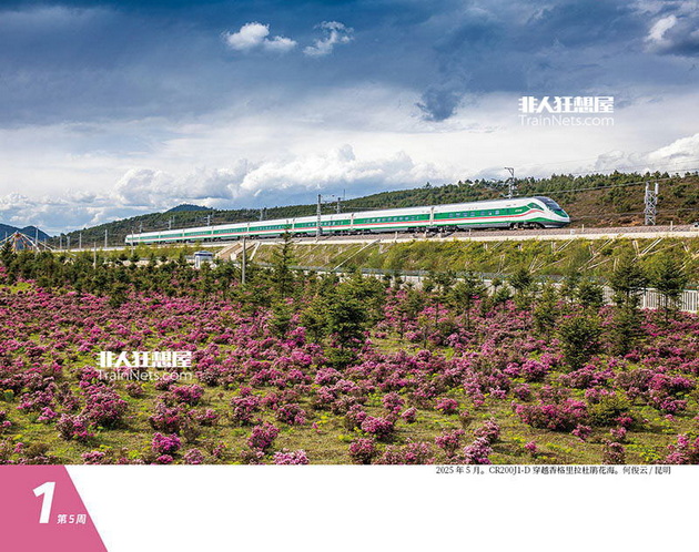 2025年5月22日,滇藏铁路云南段(丽香线)。CR200J1-D型高原动车组穿越香格里拉杜鹃花海。