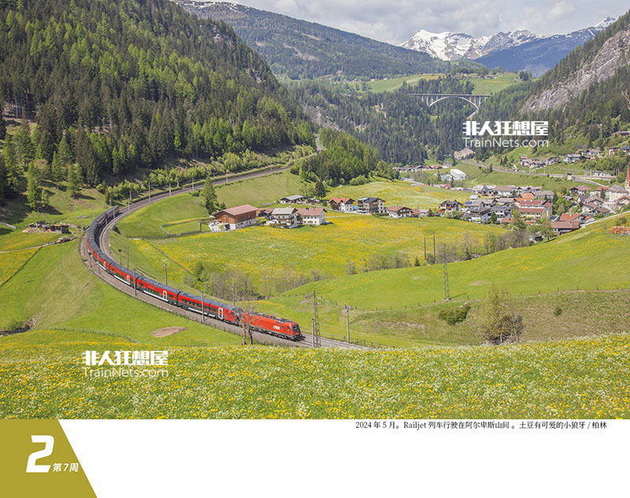 2024年5月。ÖBB 1216型机车牵引第二代Railjet列车担当Bologna Centrale-München Hbf RJ88次行驶在阿尔卑斯山间。Brennerbahn穿越阿尔卑斯山脉,是连接奥地利与意大利的重要干线,欧洲最重要的南北铁路走廊之一 。