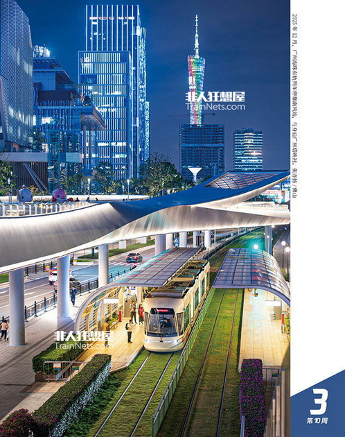 2025年12月,广州海珠有轨列车停靠南风站,与身后广州塔映衬。