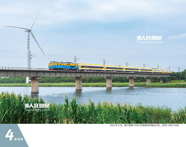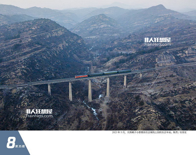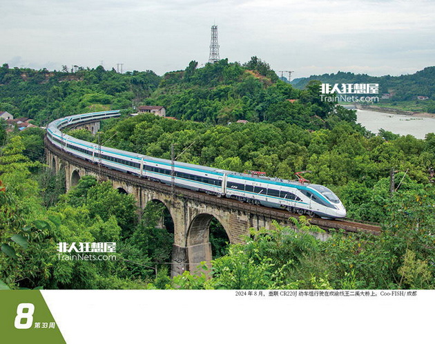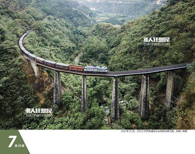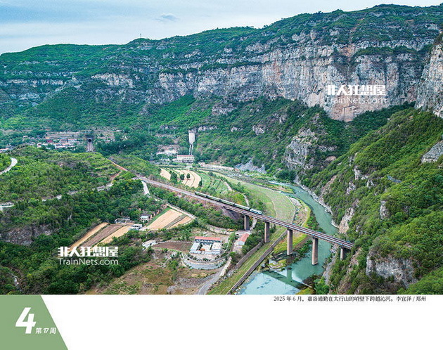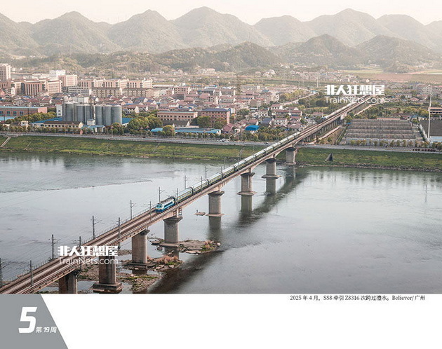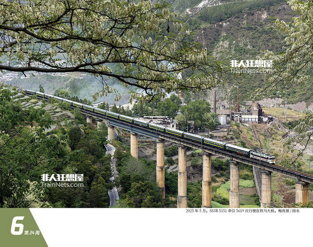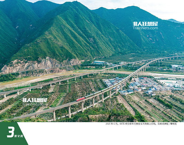2025年6月。SS7E牵引客车行驶在宝天铁路上行线,蜿蜒的河流与雄伟的大桥交相辉映,气势磅礴。