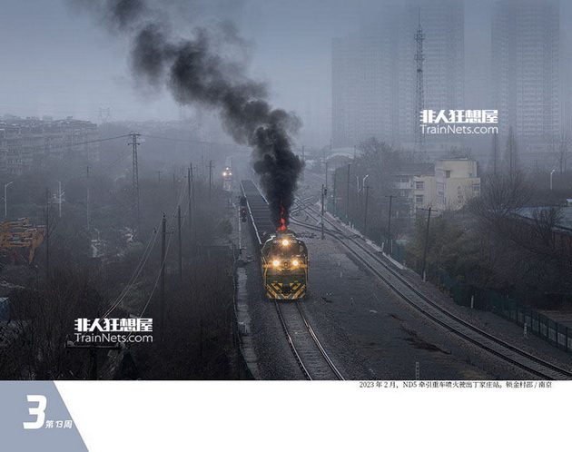 2023年2月,朦胧的冬日细雨间,ND5-309牵引煤炭重车喷火驶出南京城北换线丁家庄站。