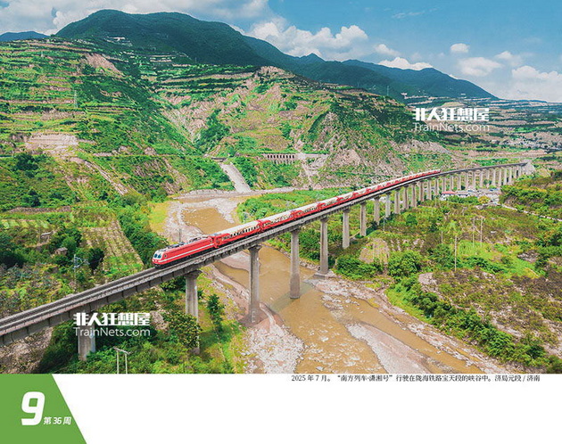 2025年7月。兰局兰段SS7E牵引Y457“南方列车·潇湘号”旅游列车行驶在陇海铁路宝天段的峡谷中,火红的车身与蓝天形成鲜明对照。