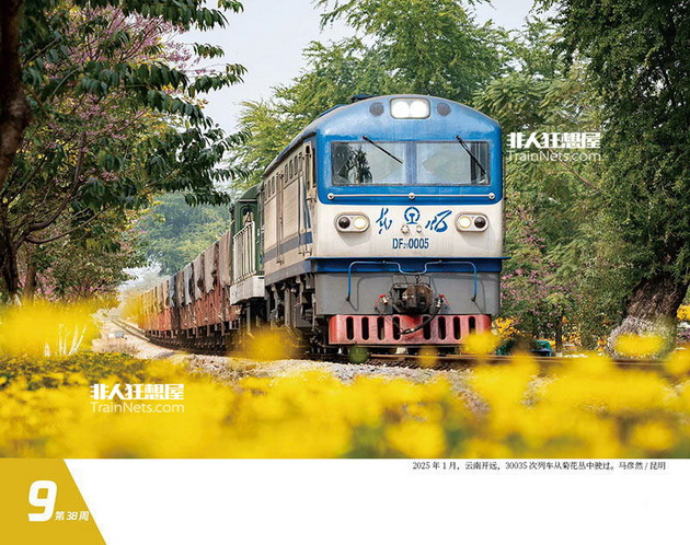 2025年1月,滇南的早春时节,昆河线开远南场-玉林山站区间,30035次列车从菊花丛中驶过。