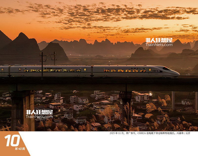2025年11月,贵广客专,CRH2A在晚霞下穿过喀斯特地貌区。
