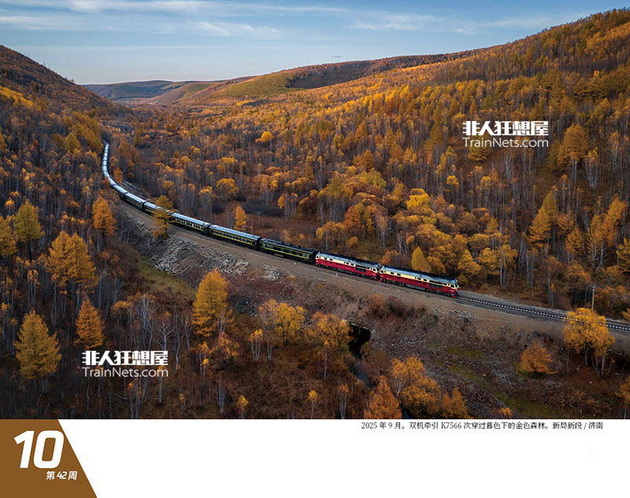 2025年9月。巍巍大兴安,梦幻阿尔山。内蒙古兴安盟阿尔山市,沈局白段DF4D-0192+0441双机牵引K7566次(阿尔山~沈阳)穿过暮色下的金色森林,即将驶入白阿铁路南兴安隧道。