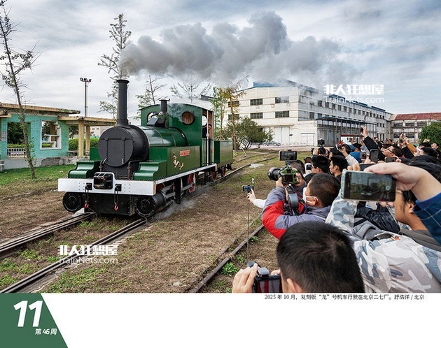2025年10月18日,复刻版“龙”号机车行驶在北京二七厂内的铁路上,来此参观的车迷们纷纷记录下这一时刻。