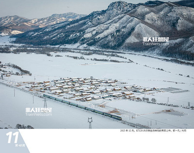 2025年12月15日。汤林铁路。哈局三段DF11牵引K7128次行驶在柳树站附近的雪原之中。