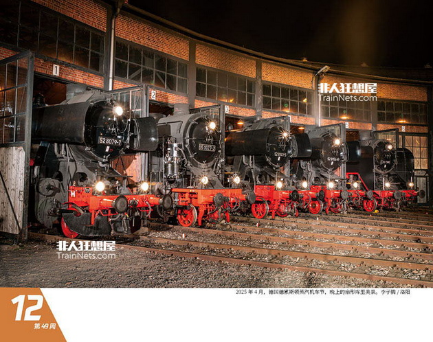 2025年4月,第17届德国德累斯顿蒸汽机车节,晚上所有蒸汽机车整齐地停在路上扇形库里。
